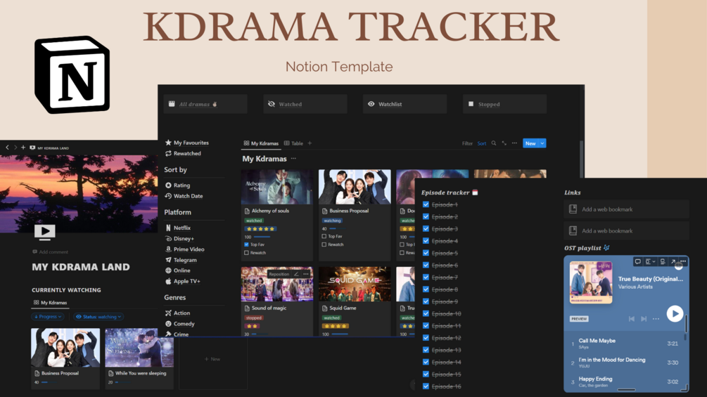 Are you a Korean Drama addict? Then this idea template is ideal for you. You can keep track of the kdramas you wish to watch or intend to watch. It also includes an episode tracker so you can keep track of your progress. It also includes several simpler navigation options. In this template, you may even listen to your favorite OST. Not to mention that if you are watching it online, you may add links that will take you to that page with a single click. So, what are you holding out for? Download and have fun! Best in Dark theme
